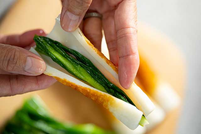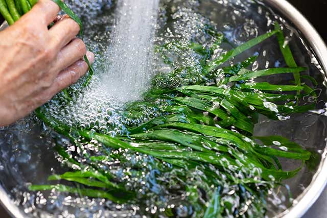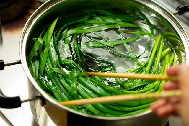 塩を入れた湯に茎のほうから入れ、30秒ほど湯がく。