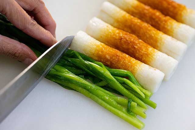 ちくわを縦に切り込みを入れる。ニラをちくわの長さを合わせて切る。