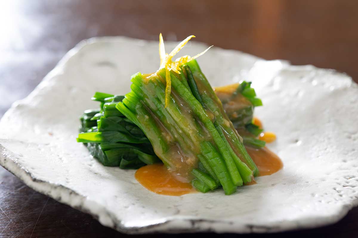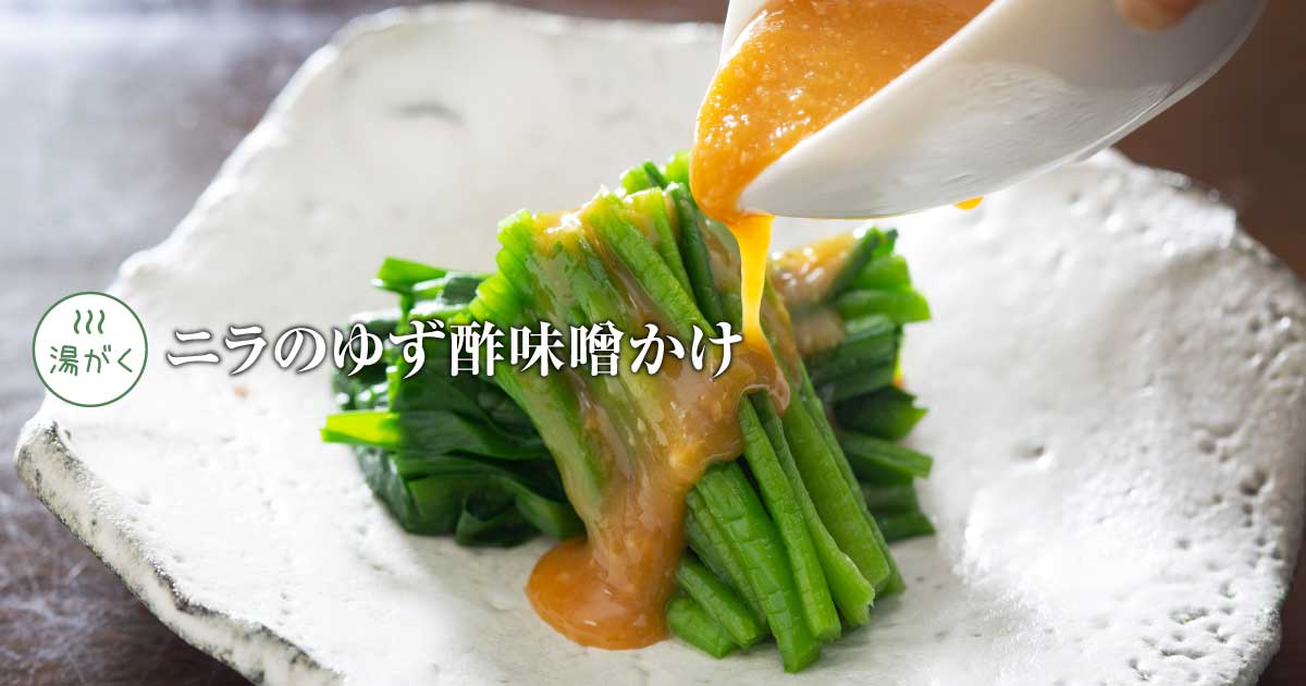 ニラは水気をよく絞り、3cm幅でカットして盛りつけ、ゆず酢味噌をかけて完成。
