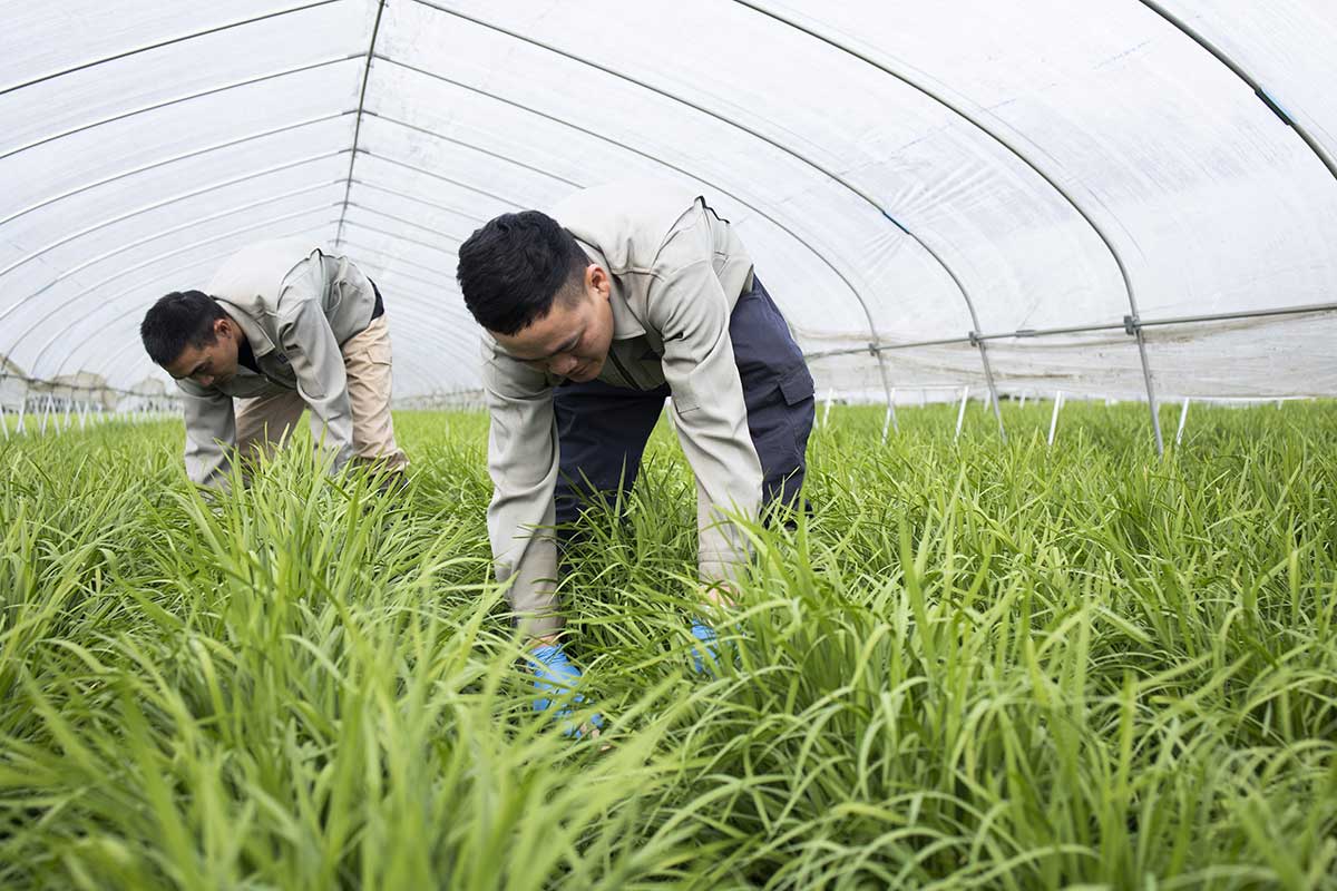 土の成分を健康な状態にバランスよく保つため、連作を避け、ニラづくりの間に、イネ科やマメ科の牧草を植え、十分に休ませるようにしています。牧草を作ることによって土に多種類の微生物が増え、健康な土になるのです。